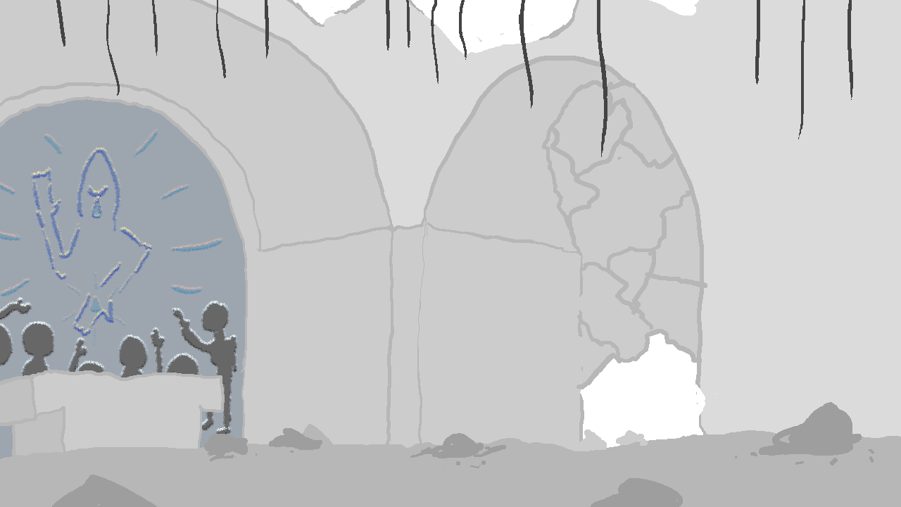 Mustaan kaapuun pukeutunut hahmo partioi keskilaivaa luoden ainoan särön ikiaikaiseen hiljaisuuteen. Tyhjiä puisia penkkirivistöjä peitti kerros tomua, laastinkappaleita ja harmaita tiilenpalasia. Taivaan luonnoton valo loi tilaan epäsäännöllisiä varjoja tunkeutuessaan sisään osittain sortuneen katon ammottavista aukoista.