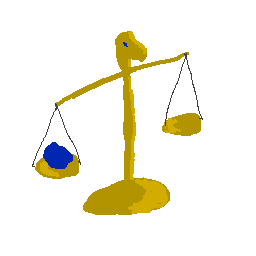 Kultainen vaaka, jonka toisessa kupissa on sininen, huokoinen kivi.